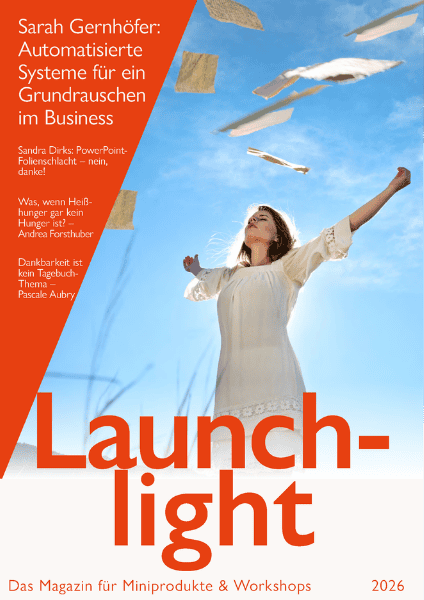 „Liebe auf den ersten Launch“ ist das Motto des Launchlight-Magazins, in dem du über 20 Launchlight-Ladys mit ihren Kennenlernangeboten und exklusiven Gutscheincodes und Rabatten findest. Sie stellen dir ihre Miniprodukte, Minikurse und Workshops aus Bereichen wie Onlinebusiness, Marketing, Gesundheit, Persönlichkeitsentwicklung sowie Familie, Kinder und Frauen in der Lebensmitte vor.